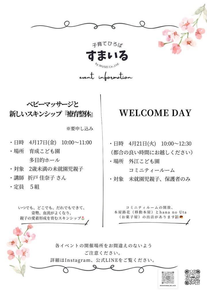 すまいる 【ベビーマッサージと新しいスキンシップ】育成こども園、【WELCOME DAY】外江こども園 両園で開催!