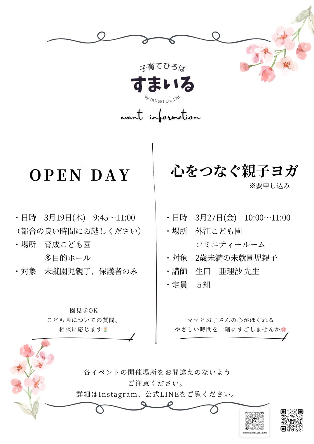 すまいる 【OPEN DAY】育成こども園、【心をつなぐ親子ヨガ】外江こども園 両園で開催!