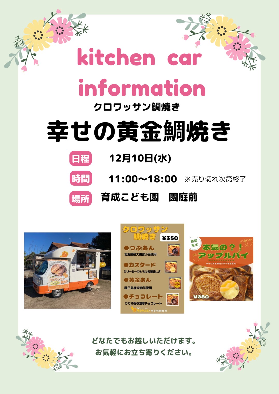 キッチンカー クロワッサン鯛焼き が育成こども園園庭前に出店!